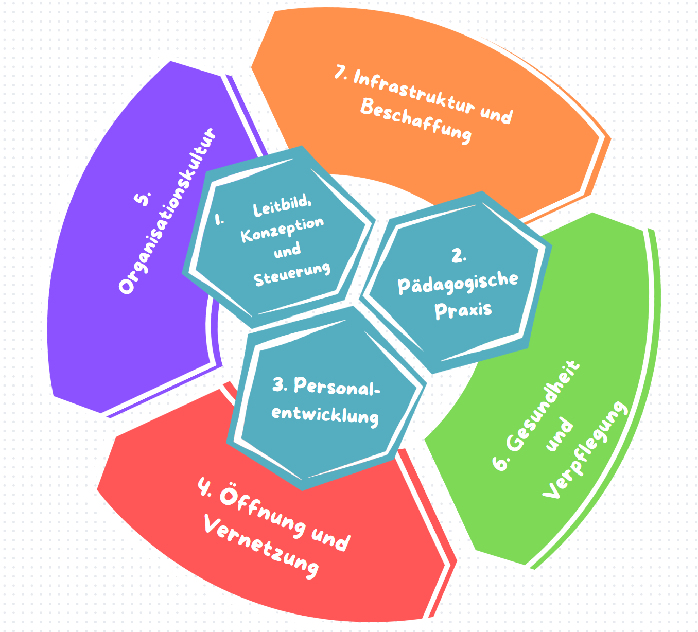 Die Qualifizierungsphase unserer Teilnahme-Kitas ist in vollem Gange. Klar, dass der neu erstellte Qualitätsrahmen mit seinen 7 Bereichen irgendwann eingeführt, erklärt, verinnerlicht werden soll.